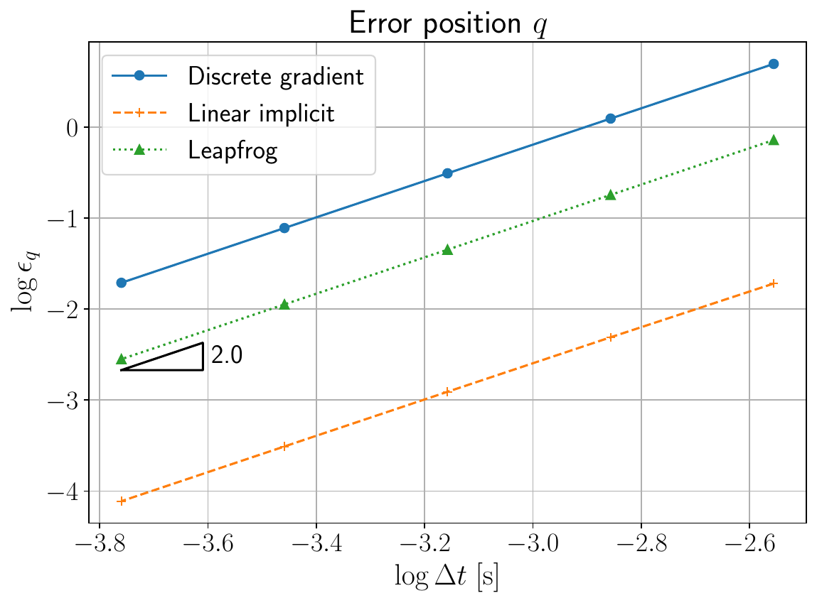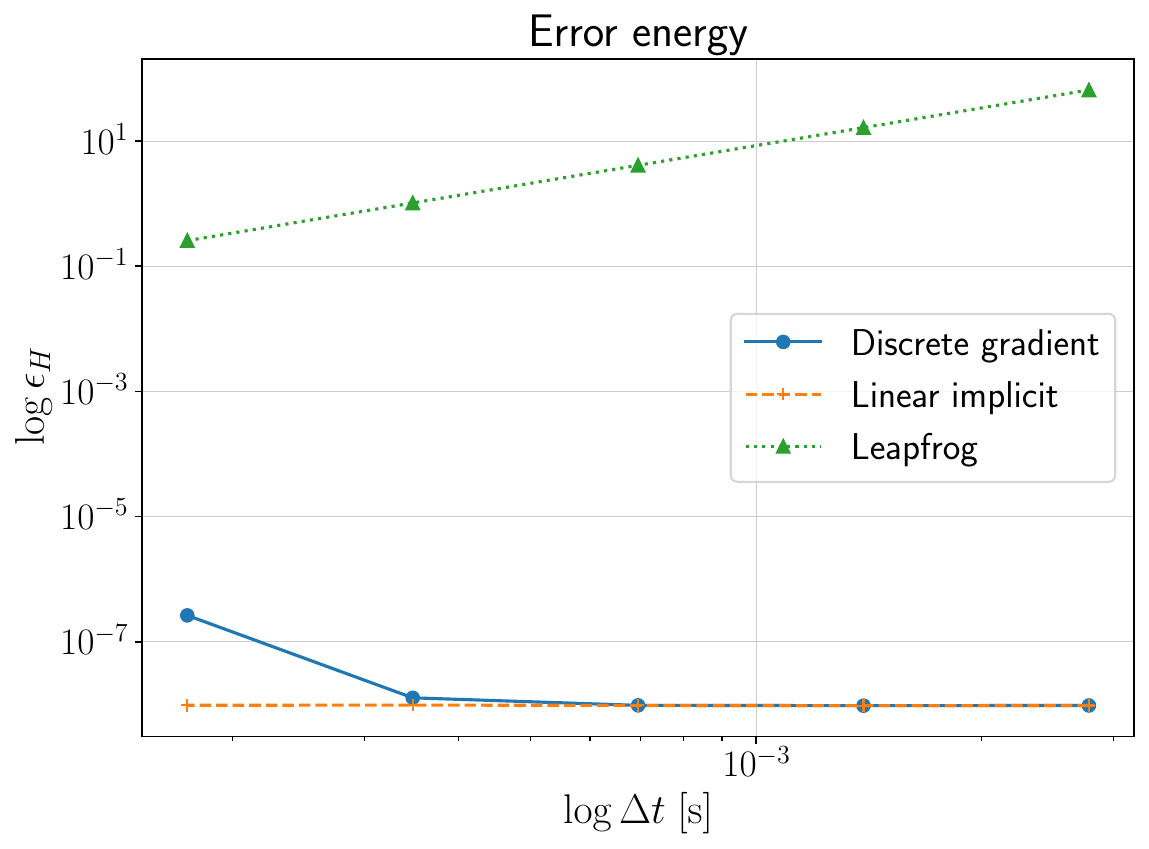 The intergration is capable of preserving the energy exactly and has a lower error with respect to other integrators Figure 3.
